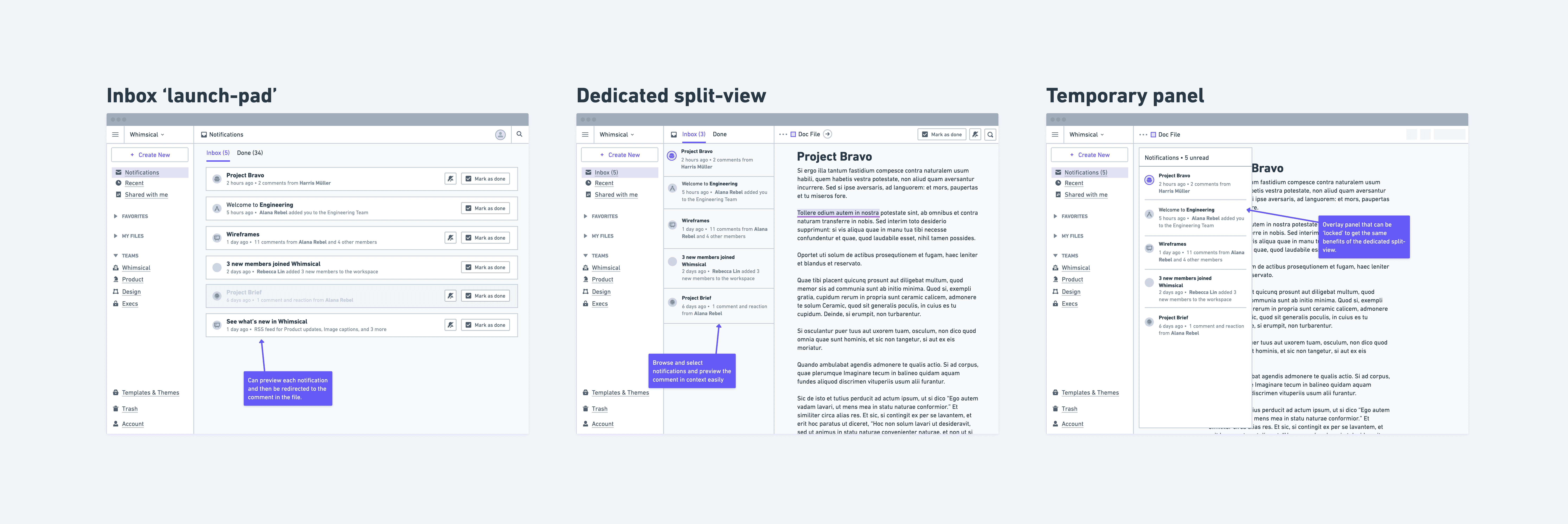 I led the design and project delivery for encouraging people to collaborate, hold conversations and make decisions in Whimsical as the business moved towards a "Team Hub" vision.